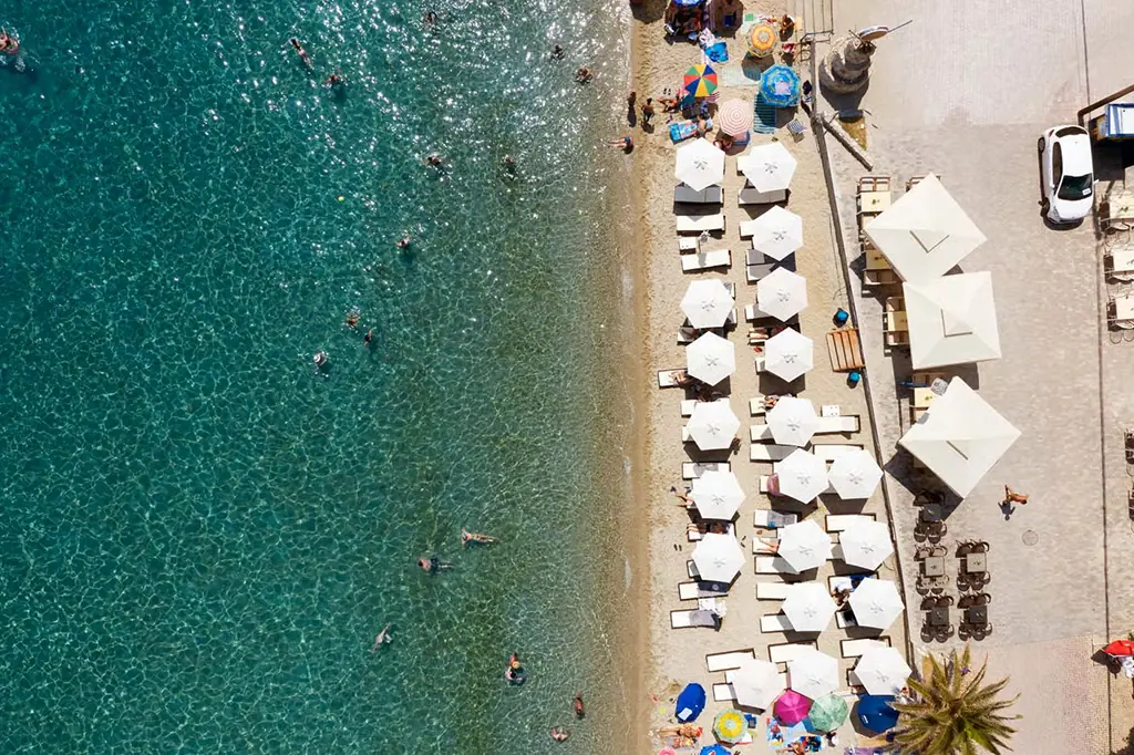 A long stretch of soft sand and organized beach bars offering sunbeds, umbrellas, and light snacks. The water is calm, warm, and ideal for long swims.