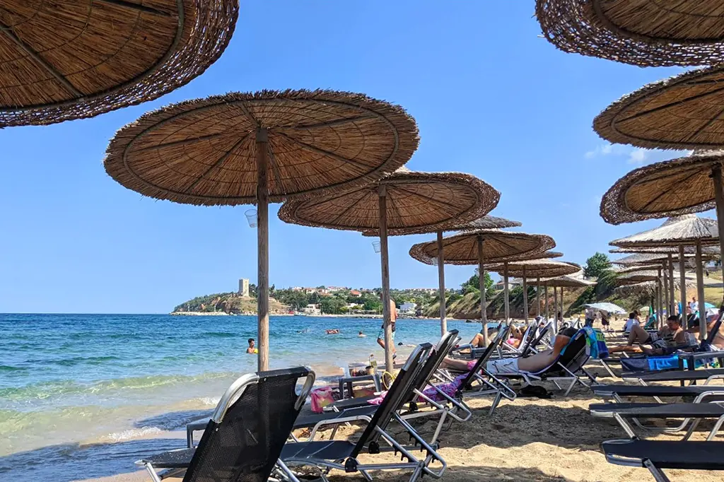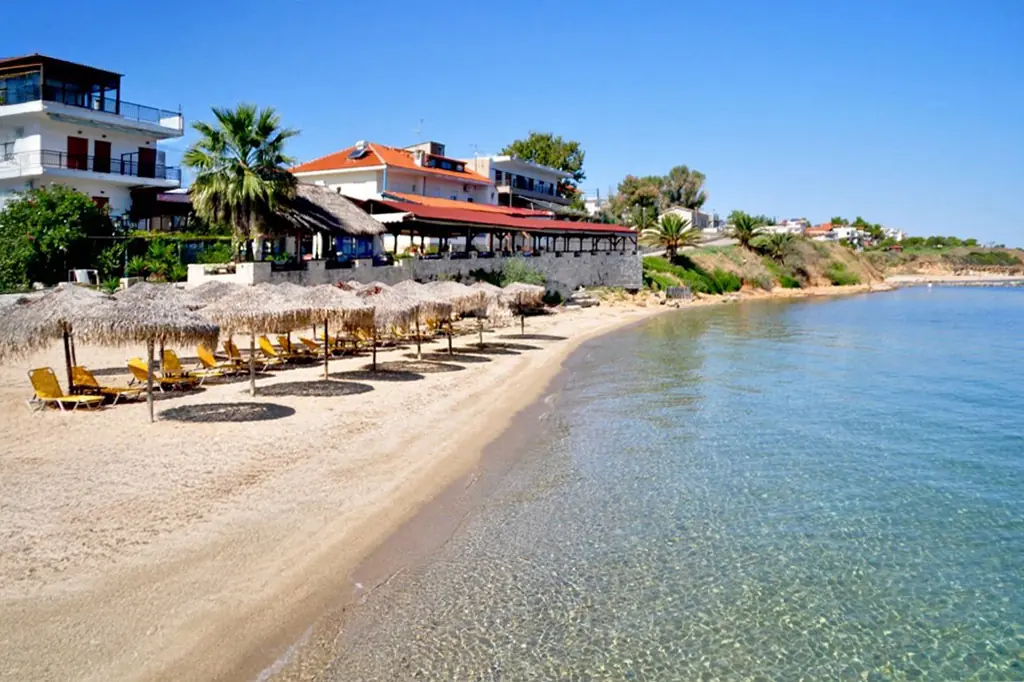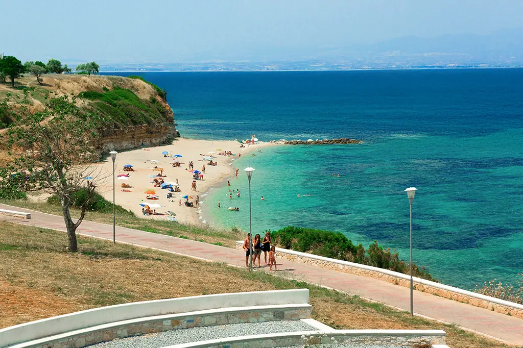 A long, sandy coastline with clear blue water stretches along the village. It offers sunbeds, umbrellas, gentle waves, and several beach cafés—great for a relaxed day by the sea.