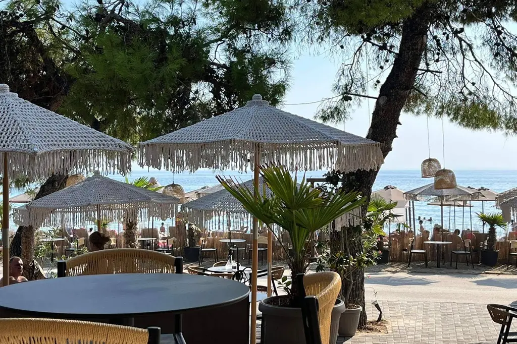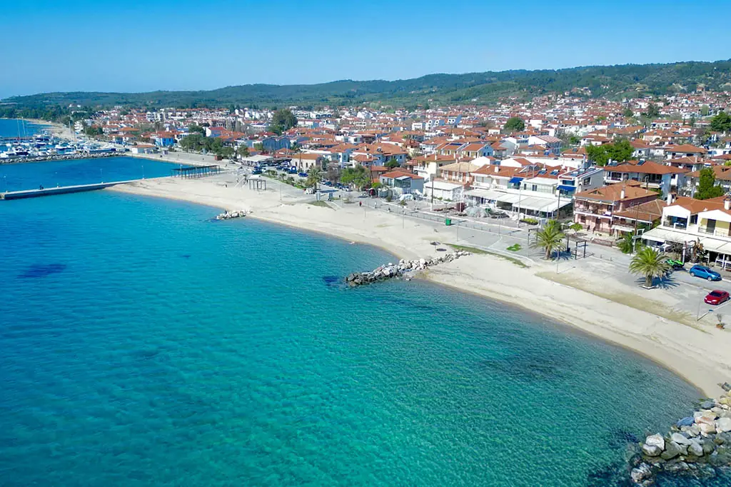 Nikiti boasts one of Sithonia’s most accessible and family-friendly coastlines. Its long stretch of soft golden sand, calm turquoise sea, and well-organized beach bars make it ideal for sunbathing, swimming, and water sports. The promenade’s wide pedestrian path is perfect for evening walks by the sea.