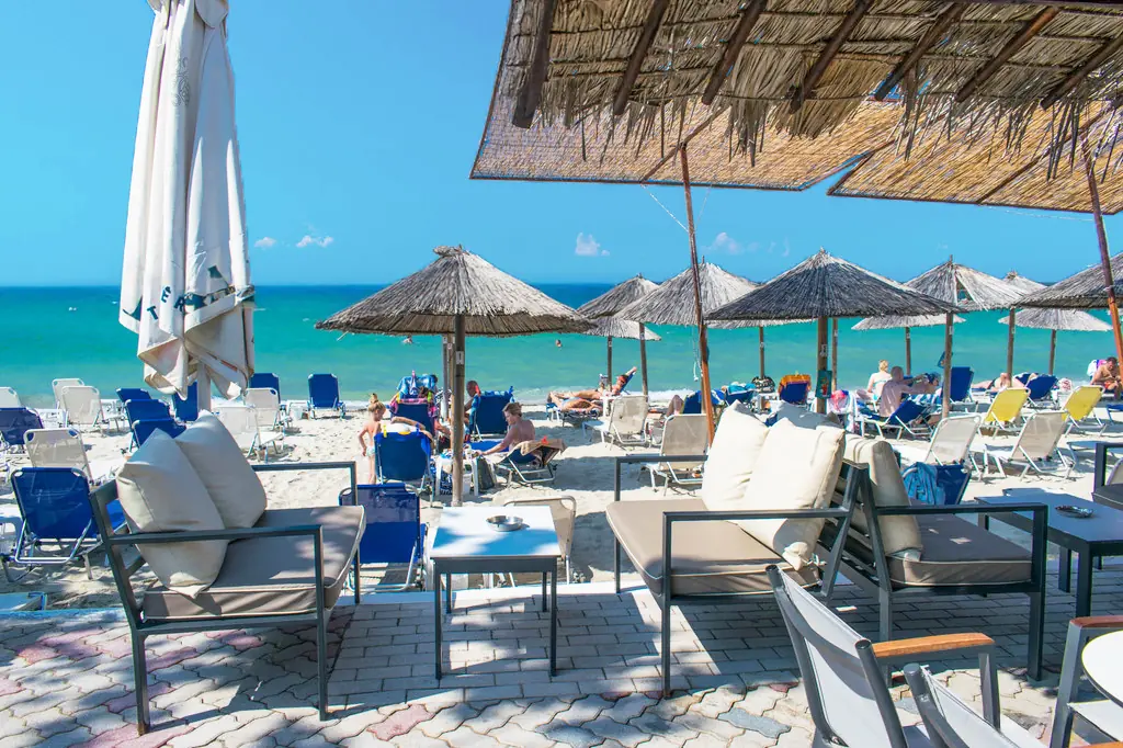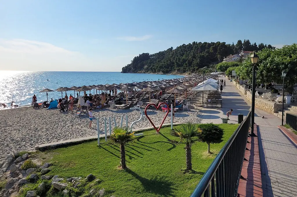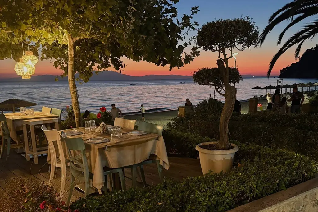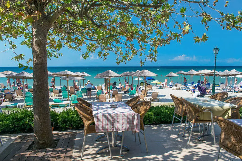Siviri’s long, sandy beach is its main attraction. Sheltered with shallow, clear turquoise water, it’s perfect for families, swimmers, and anyone who enjoys calm seas. The beach is well-organized with sunbeds, beach bars, and shaded areas, yet still offers quiet corners ideal for reading or unwinding.