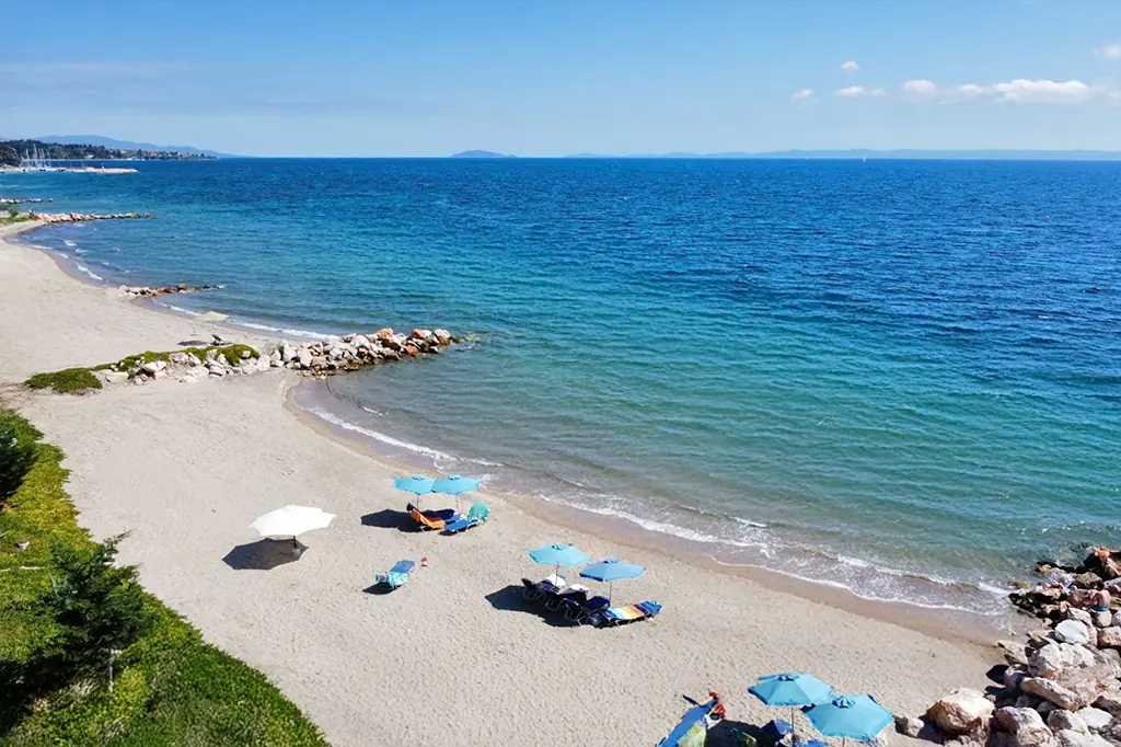 The beach in Nikiti is pebble-sandy, ideal for relaxing and swimming.